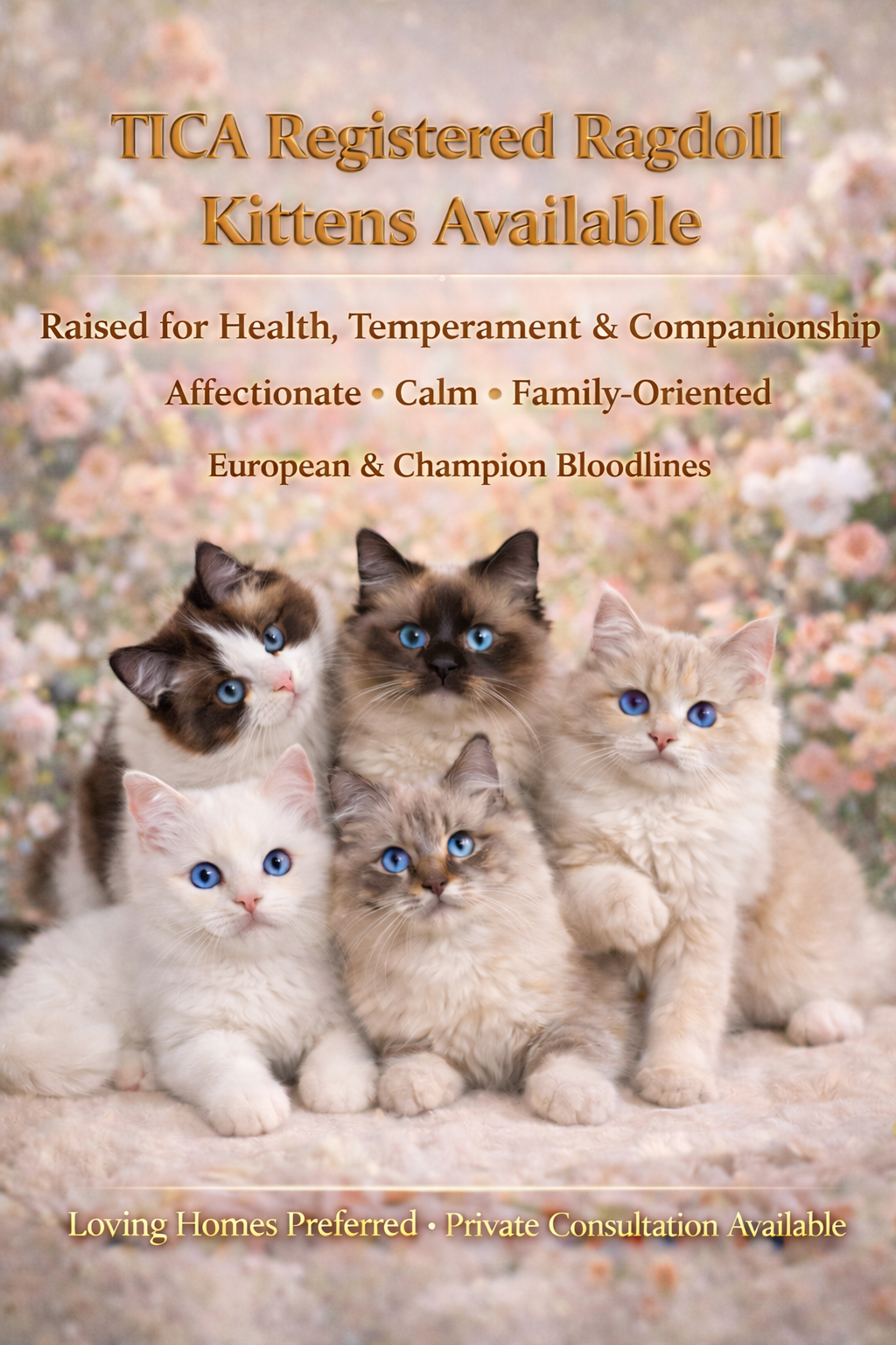 We have TICA-registered Ragdoll kittens available from an established, ethical breeding program focused on health, temperament, and companionship.